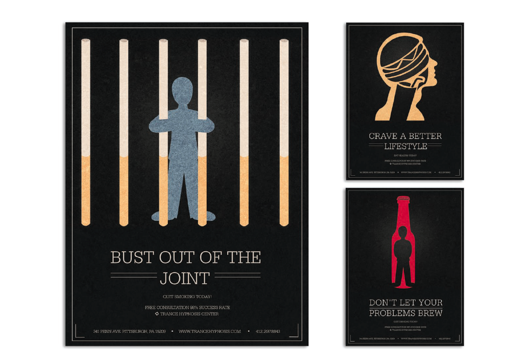 This is a classified ad series for Trance Hypnosis, located in Pittsburgh, PA. Their three main points of service are for smokers, those who wish to lose weight or transform their lifestyle, and alcoholics. This campaign targets these three audiences, and each poster has a tagline caters to that particular crowd.